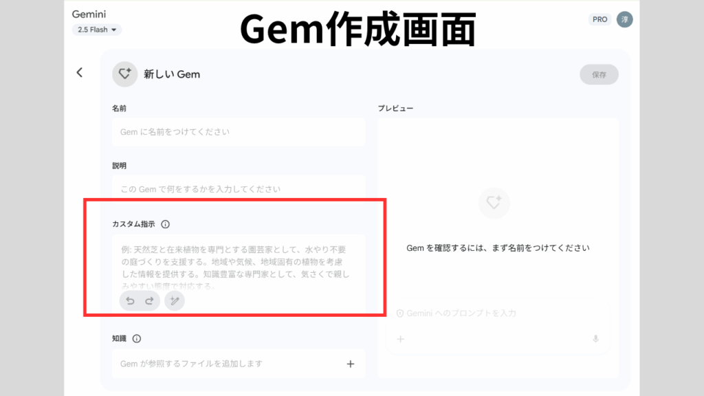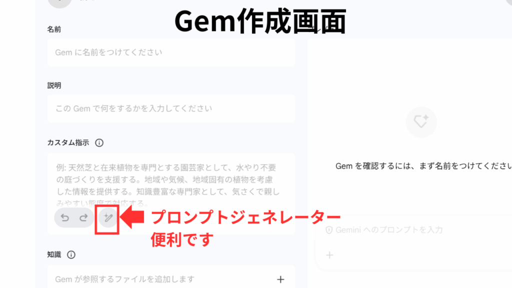 Gemini は「Gem」という機能を使って、ユーザーが独自にカスタマイズすることが可能です。「Gem」のプロンプト入力欄に「カスタム指示」にGeminiボタンがあり、プロンプトを適正化してくれます。
