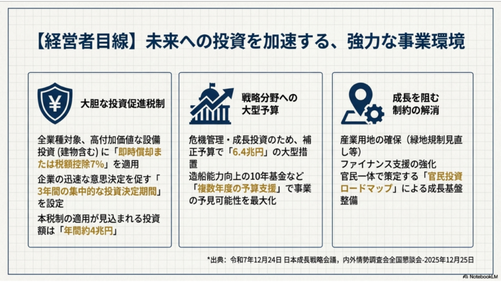 具体的な予算措置、税制優遇、そして投資ロードマップが示されており、これを経営計画に組み込むかどうかで、今後3〜5年の企業成長が大きく変わります。