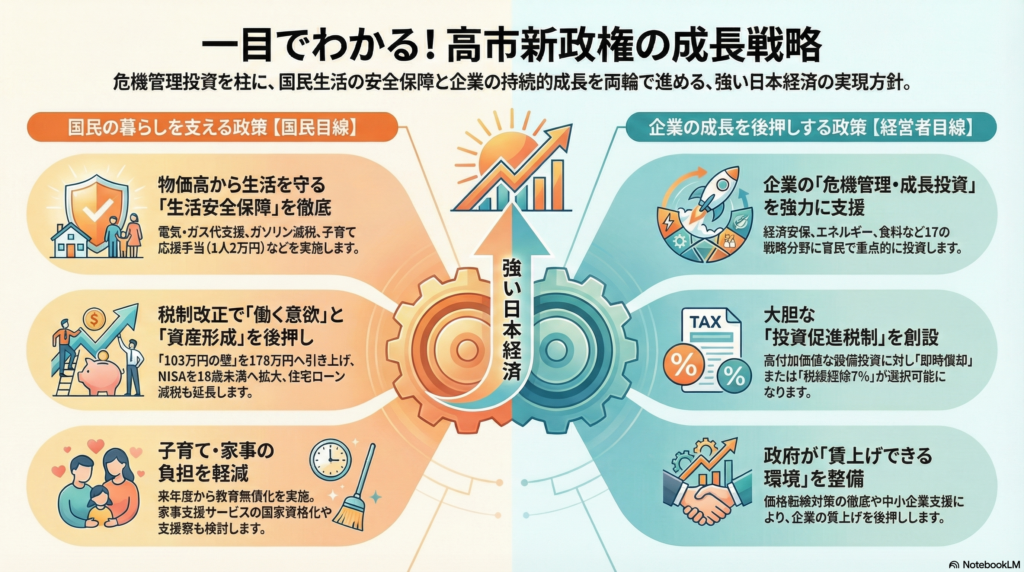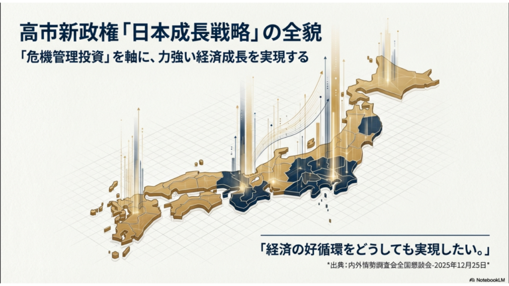 高市政権は「危機管理投資こそが最大の成長エンジン」と位置づけ、以下の3つの柱で成長戦略を構築しています。
