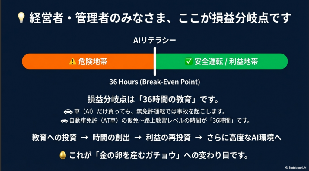 AI導入で儲からない最大の理由は、「社員に36時間以上の学習」という初期投資を惜しみ、中途半端に触らせて終わるからです。
