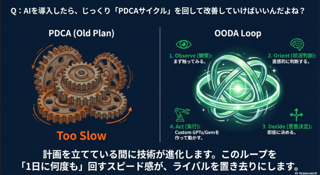 A:いいえ、AI時代に「昭和のPDCA」では遅すぎます。必要なのは「OODA(ウーダ)ループ」です。