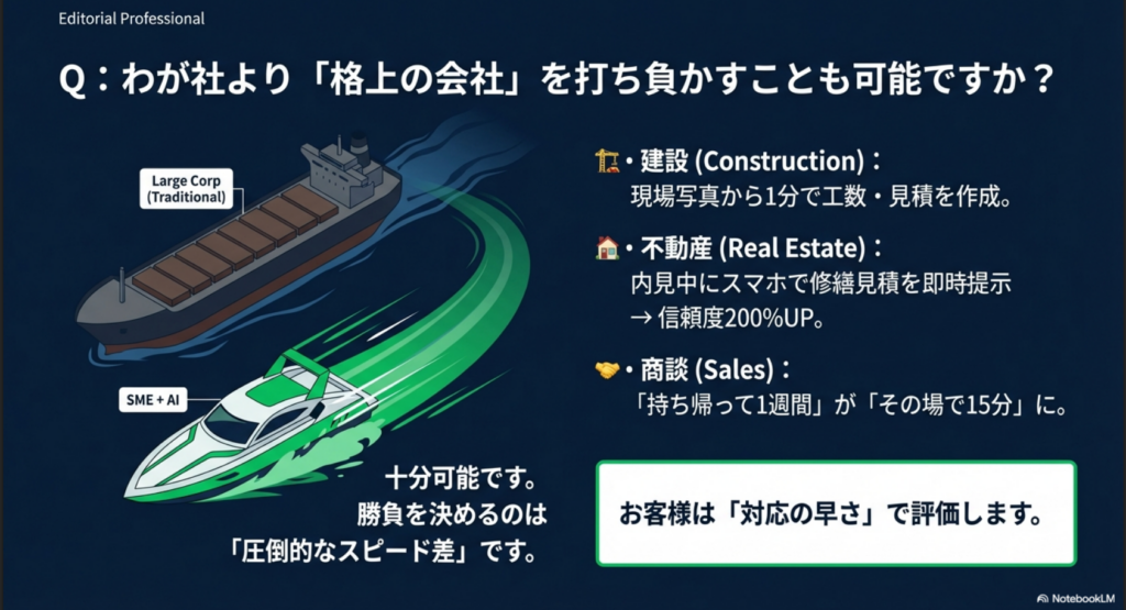 この圧倒的なスピード差がお客様の評価を変え、格上の会社を追い抜く原動力になります。