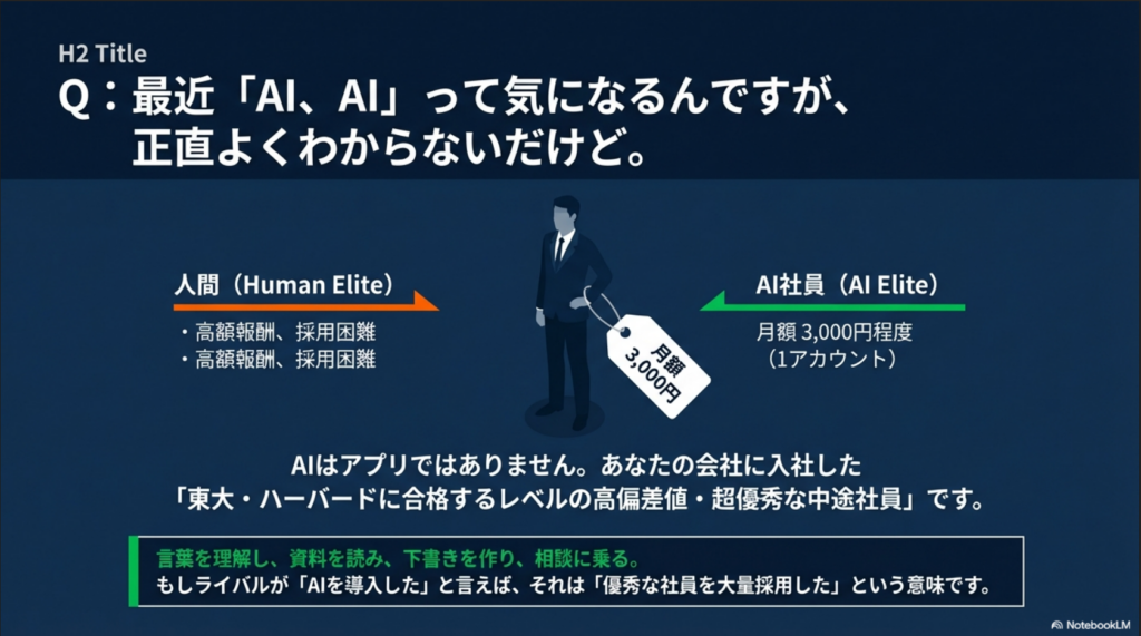 もし、友人の経営者やライバル企業が「AI導入した」と聞いたら、それは優秀な社員を大量に採用したと判断してください。