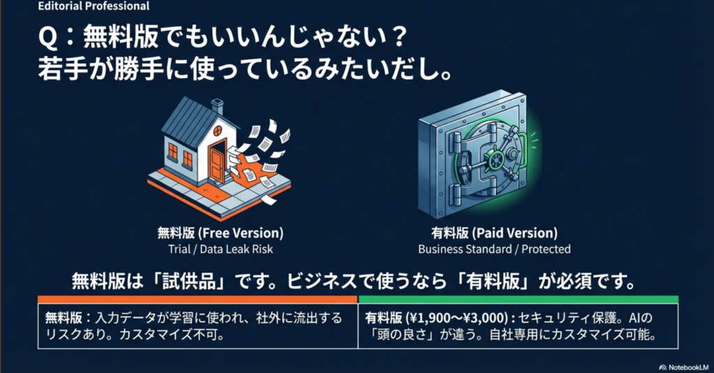 無料版はセキュリティが弱く、会社のデータを入れて「学習データ」として利用され、結果に外部に利用されるリスクがあります。