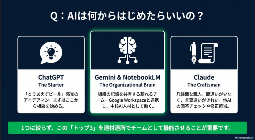 • Gemini&NotebookLM:チームで導入する場合、「組織の記憶を共有できる、頼れるAI社員達」です。わが社では、中核AI人材チームになりました。GoogleWorkspaceでGemini、NotebookLM他優秀なアプリ多数に働いてもらってます。