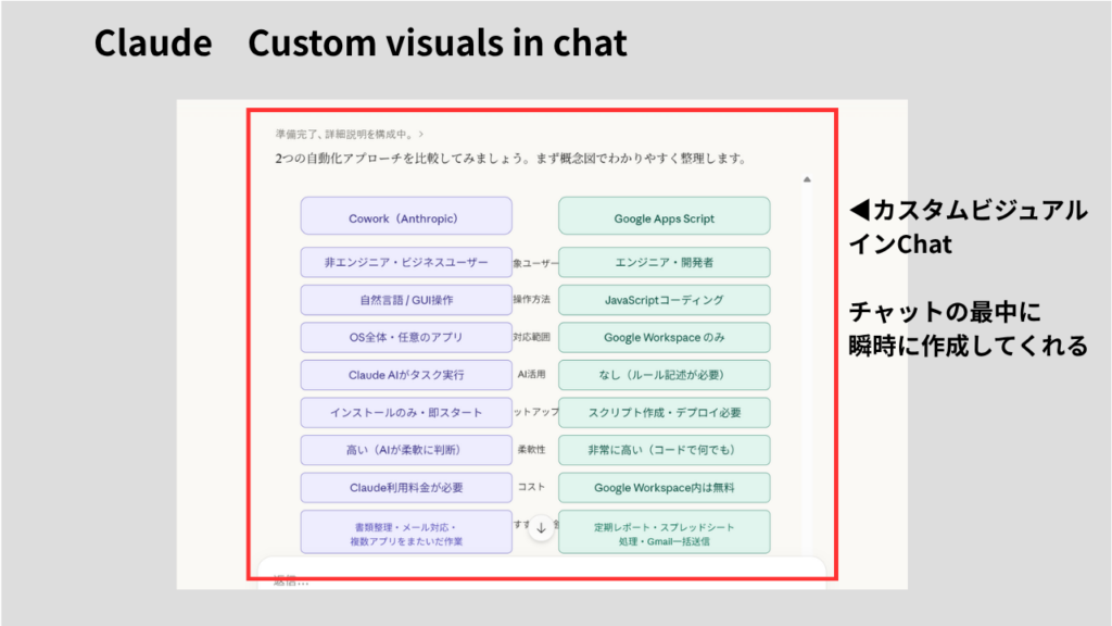 - Custom visuals in chat(2026年3月13日):チャット画面にフロー図・チャート・データビジュアライゼーションをインラインで生成する機能。全プランで利用可能。コードなし・デフォルトONで使えます。