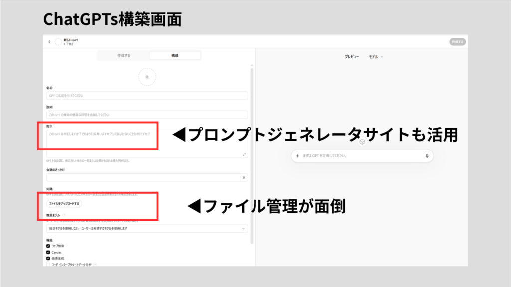 | カスタムAI | ChatGPTs(マイGPT) | Gem | なし | Projects |