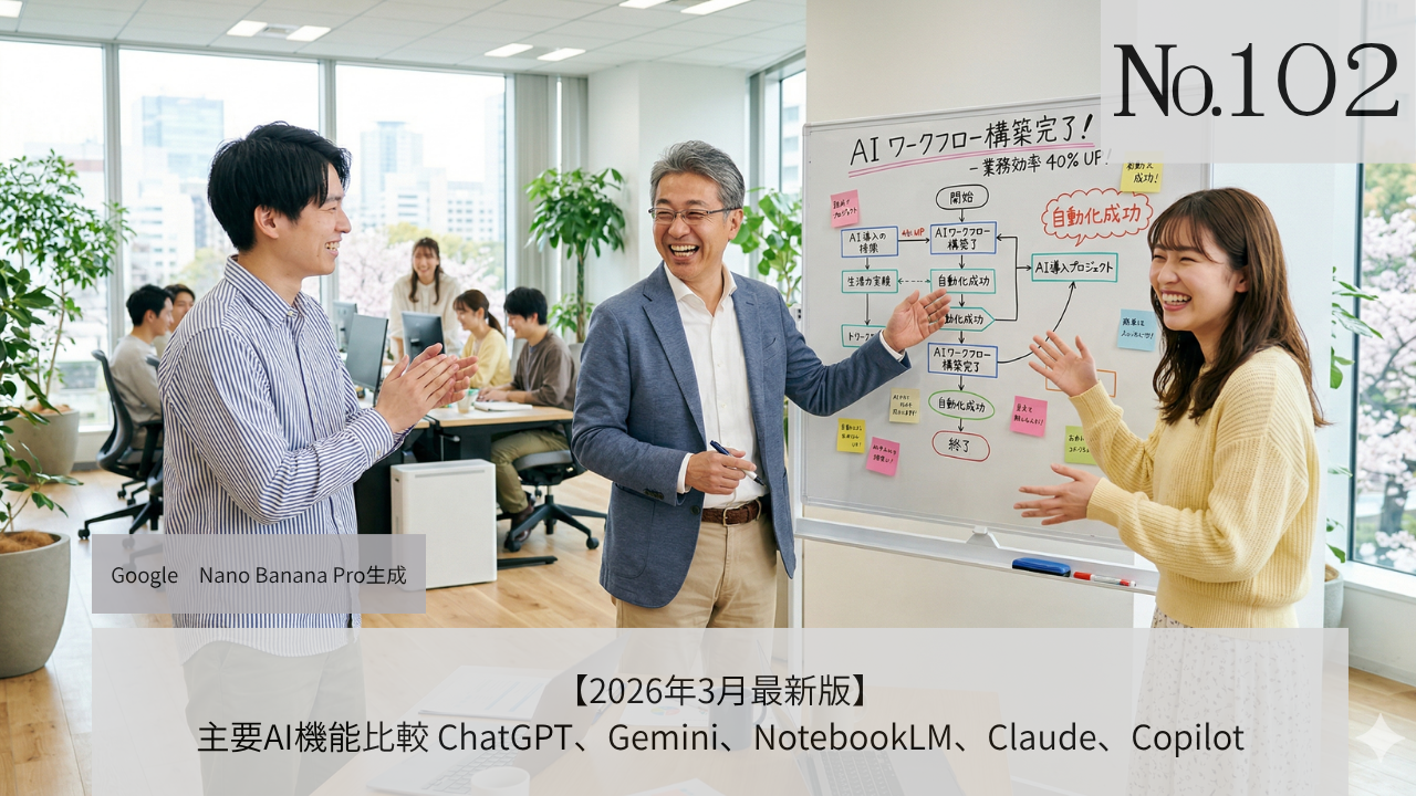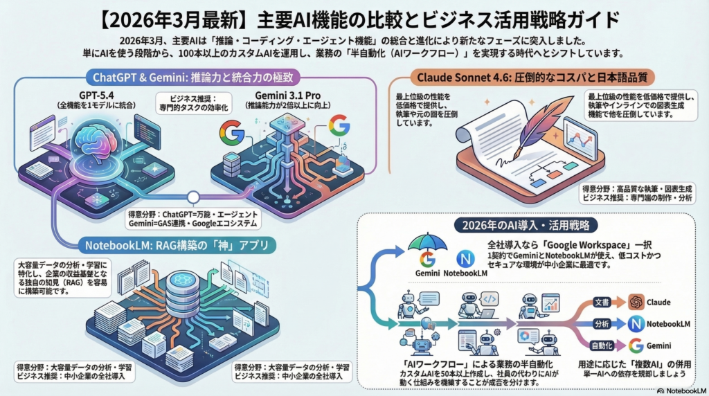 本記事では、ChatGPT、Gemini、NotebookLM、Claude、Copilot の2026年2月〜3月21日現在の最新アップデートを詳しく比較し、それぞれの特徴と強みをご紹介します。