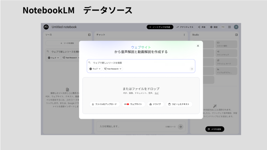 NotebookLMは、マルチモーダル対応領域が広く素晴らしいです。