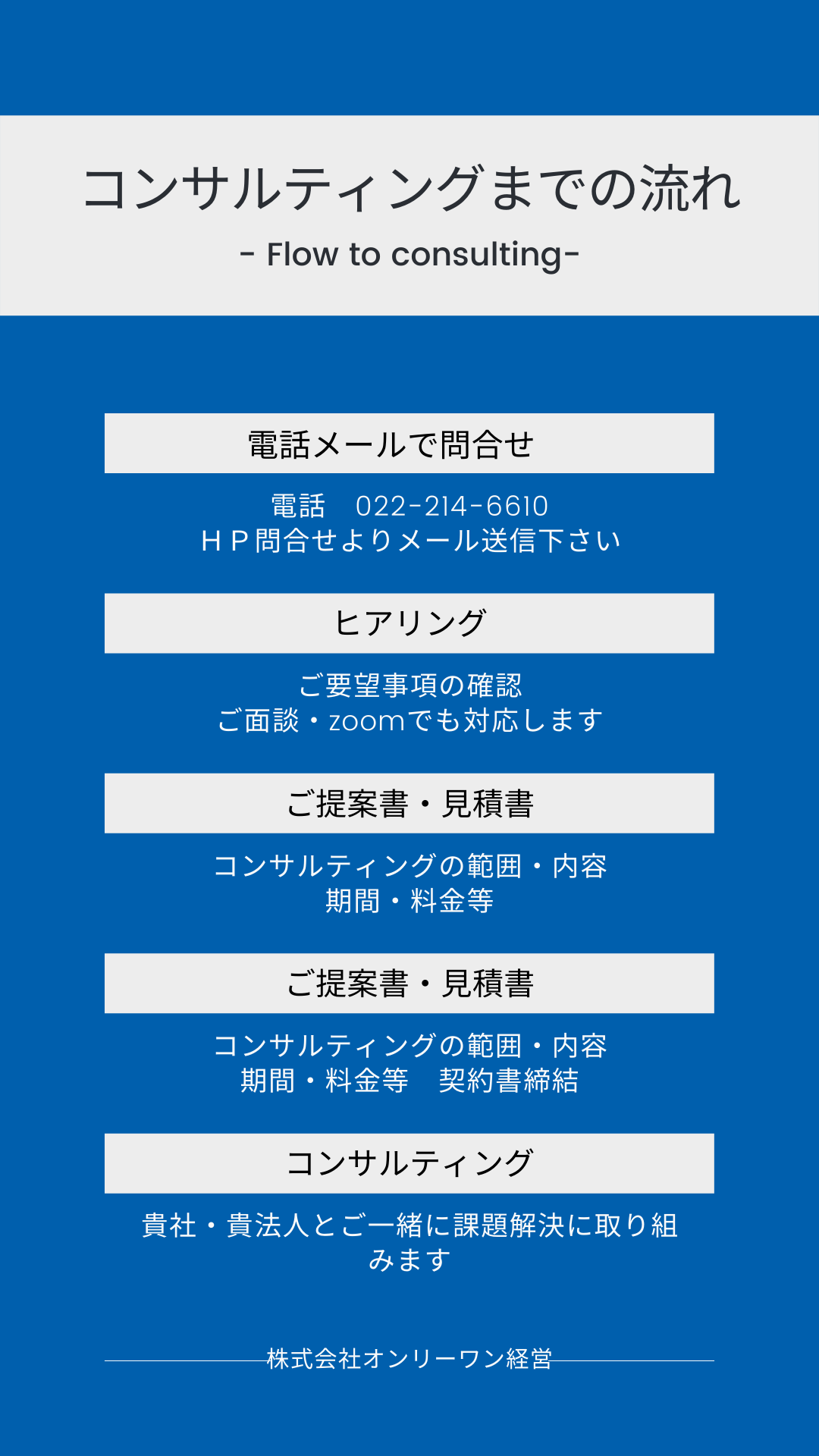 電話相談 コンサルティングまでの流れ 2025.12.14 ご相談はお電話・Zoom等でコンサルタントが直接対応します。まずはお気軽にお電話を!022-214-6610コンサルタント直通です コンサル中は、転送・携帯に着信履歴・伝言をお願いします。折り返しお電話します問合せフォーム お気軽に! 必須貴社名・法人名必須ご担当者名 必須メールアドレス お問い合わせ内容